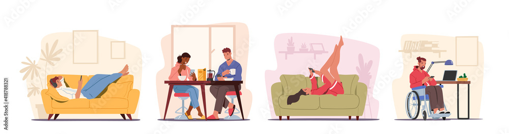 • Set People at Home with Phones. Couple Sit at Table Having Breakfast with Smartphones in Hands. Men and Women Home Relax