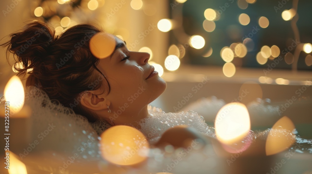 Relaks - A woman takes a calming bath surrounded by bubbles and scented candles. She uses this time to... #822552731