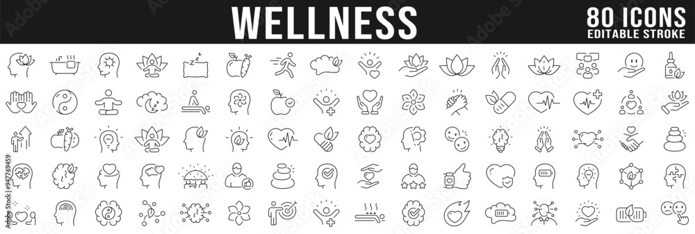 • Wellness, wellbeing, mental health, healthcare. Big set of line icons. Editable stroke