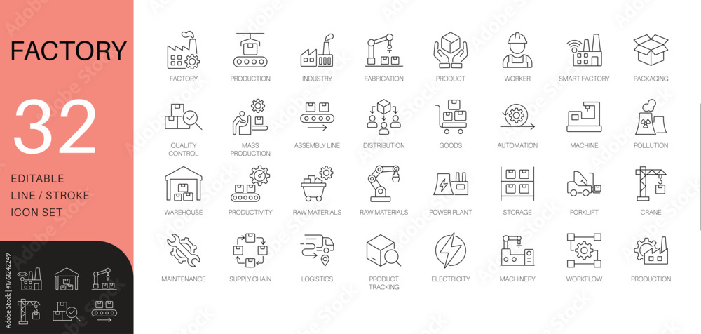 • Factory and manufacturing line icon set. Thin line vector symbols for production, automation, and supply chain. Includes robotics and smart factory icons.