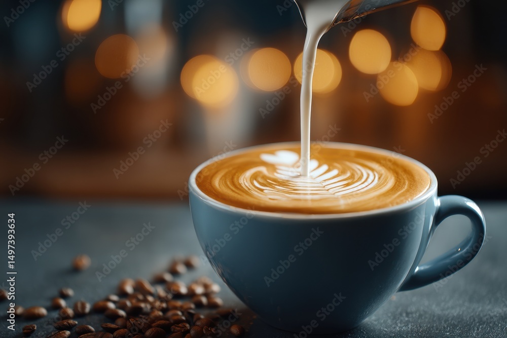 • Close-up of creamy milk pouring into coffee with latte art in a blue cup, creating a warm and inviting ambiance, surrounded by scattered coffee beans.