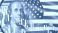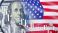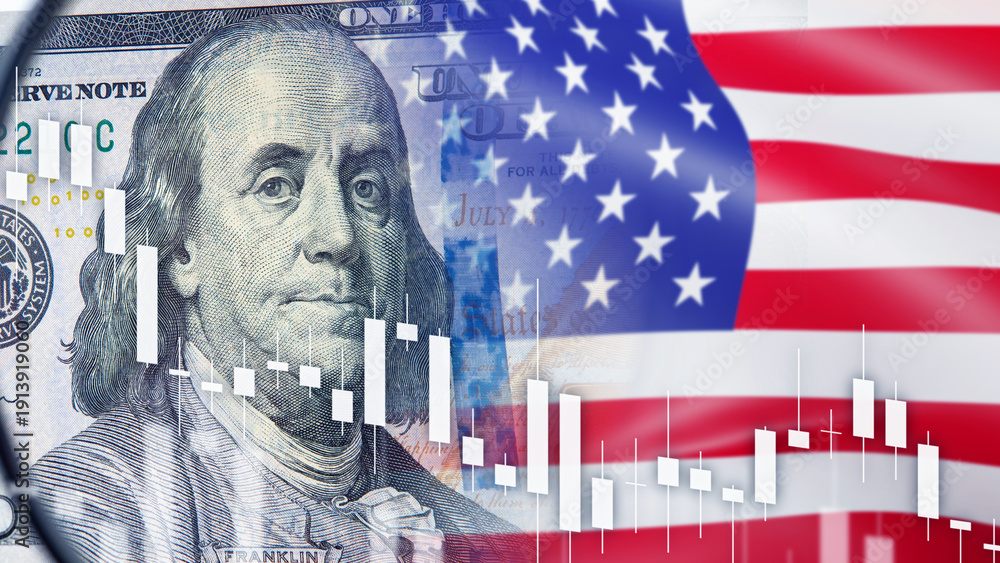 • Financial markets, US economy. Dollar banknote with American flag and candlestick chart reflects currency fluctuations, inflation trends and monetary policy impact on investment climate.