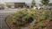 • Focused medium shot of community center retrofit showcasing contrasting impermeable and permeable parking zones with thriving vegetation in swales for enhanced drainage.