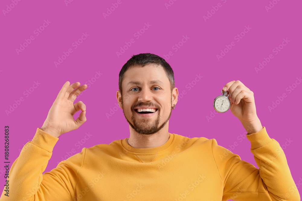 Fiolet - Young man with stopwatch showing OK on violet background #1808268083