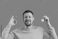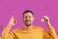 • Young man with stopwatch showing OK on violet background
