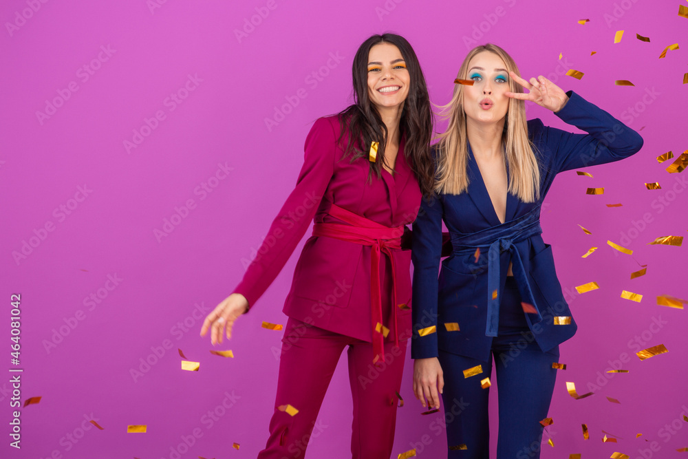 • two attractive women celebrating new year on violet background in stylish colorful evening suits of purple and blue color, friends having fun together, fashion trend, golden confetti party mood