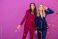 Fiolet - two attractive women celebrating new year on violet background in stylish colorful evening suits... #464081042