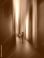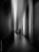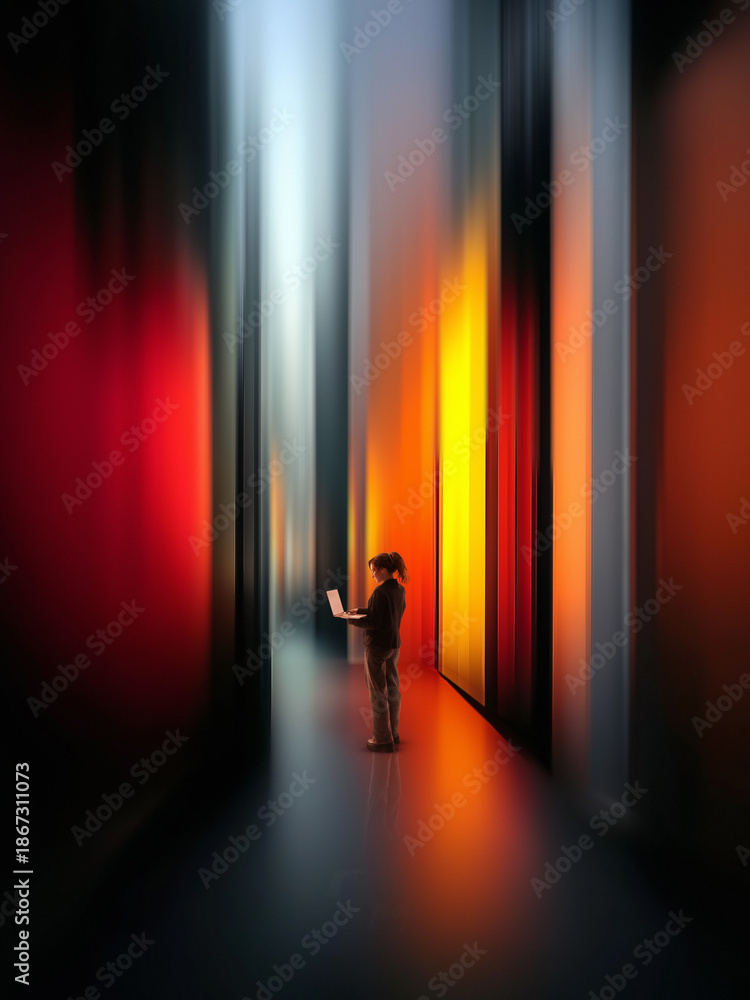 • Abstract composition with woman using laptop in vertical light corridor. Concept of digital work, remote productivity, technology solutions, modern business workflow and corporate innovation.