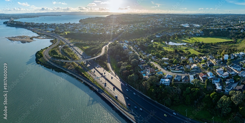 Auta - Aerial view of Auckland, New Zealand, showing the Upper Harbour Motorway bridge. Cars travel... #1817600029