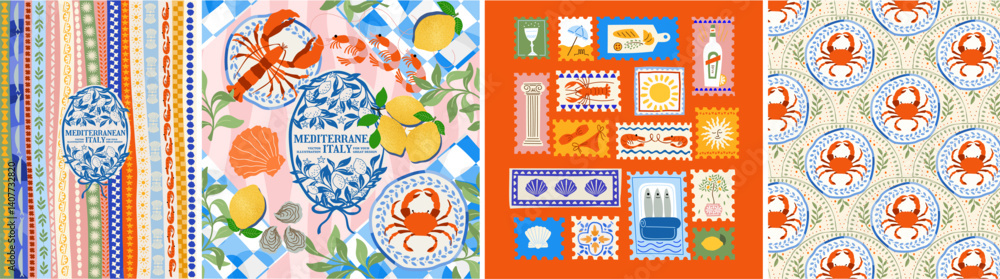 • Mediterranean summer. Vector illustration of Amalfi, Italian cuisine, striped pattern, lobster, crab, lemon, postage stamps, shell for poster, background or textile