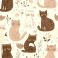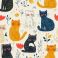 • playful hand-drawn pattern of smiling colorful cats surrounded by simple flowers and leaves, whimsical cozy cheerful illustration