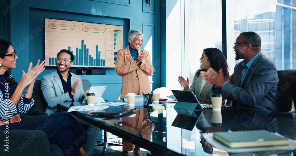 • Applause, presentation and business people in meeting, graphs and profit growth. Speaker, group and employees in workplace, investment and clapping for bonus, company revenue and charts with smile