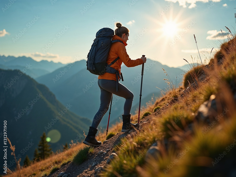 Sport - A woman is hiking up a mountain with a backpack and a pair of poles #1312971900