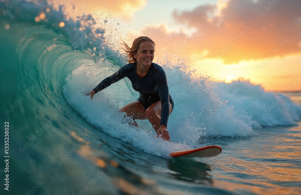 Sport - Happy surfer woman rides wave on surfboard at sunset. Female in wetsuit surfing in sea, sport... #1335238022